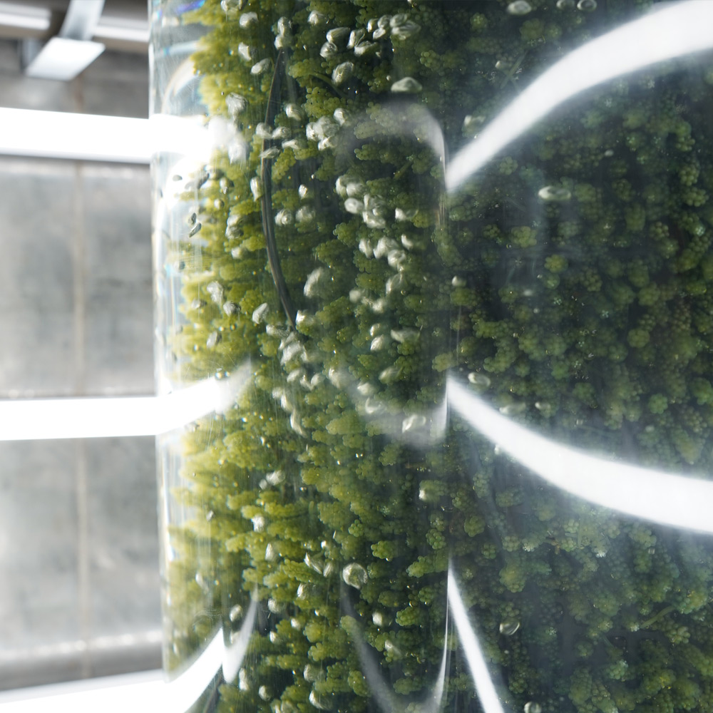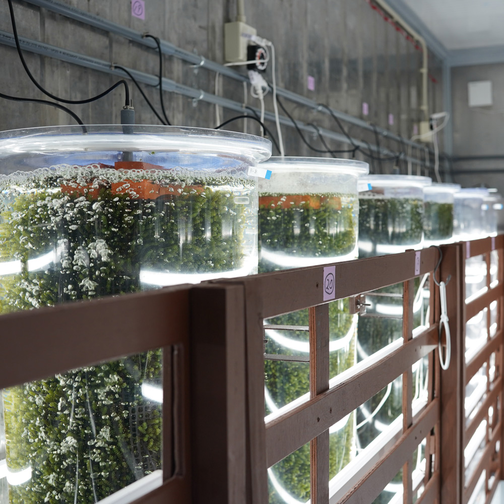 シリンダー型の水槽内では、波や潮の流れを人工的に再現し、海ぶどうが本来育つ環境を忠実に整えています。さらに、海水にCO₂を溶け込ませることで光合成を促進し、海ぶどうの健やかな成長をサポートします。