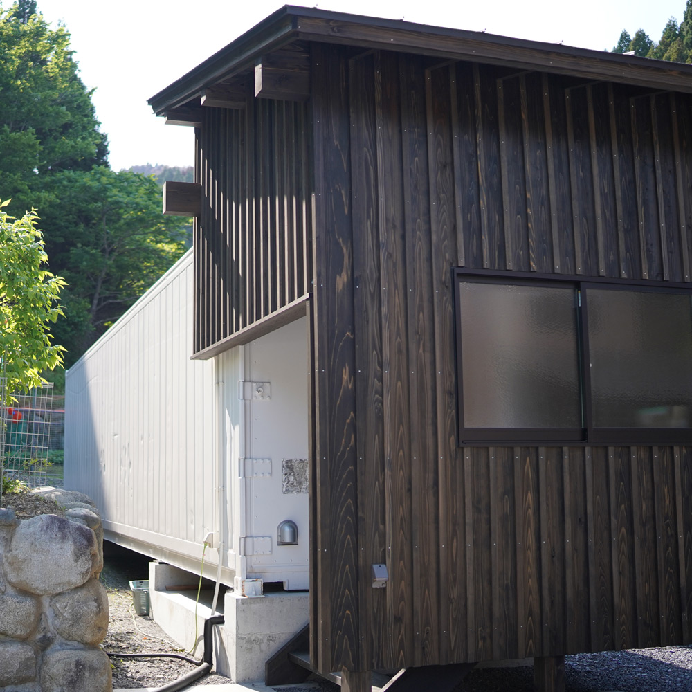 養殖施設はコンテナ内にあります。リーファコンテナにシリンダー水槽を入れることでエアコンのみで水温管理が可能です。